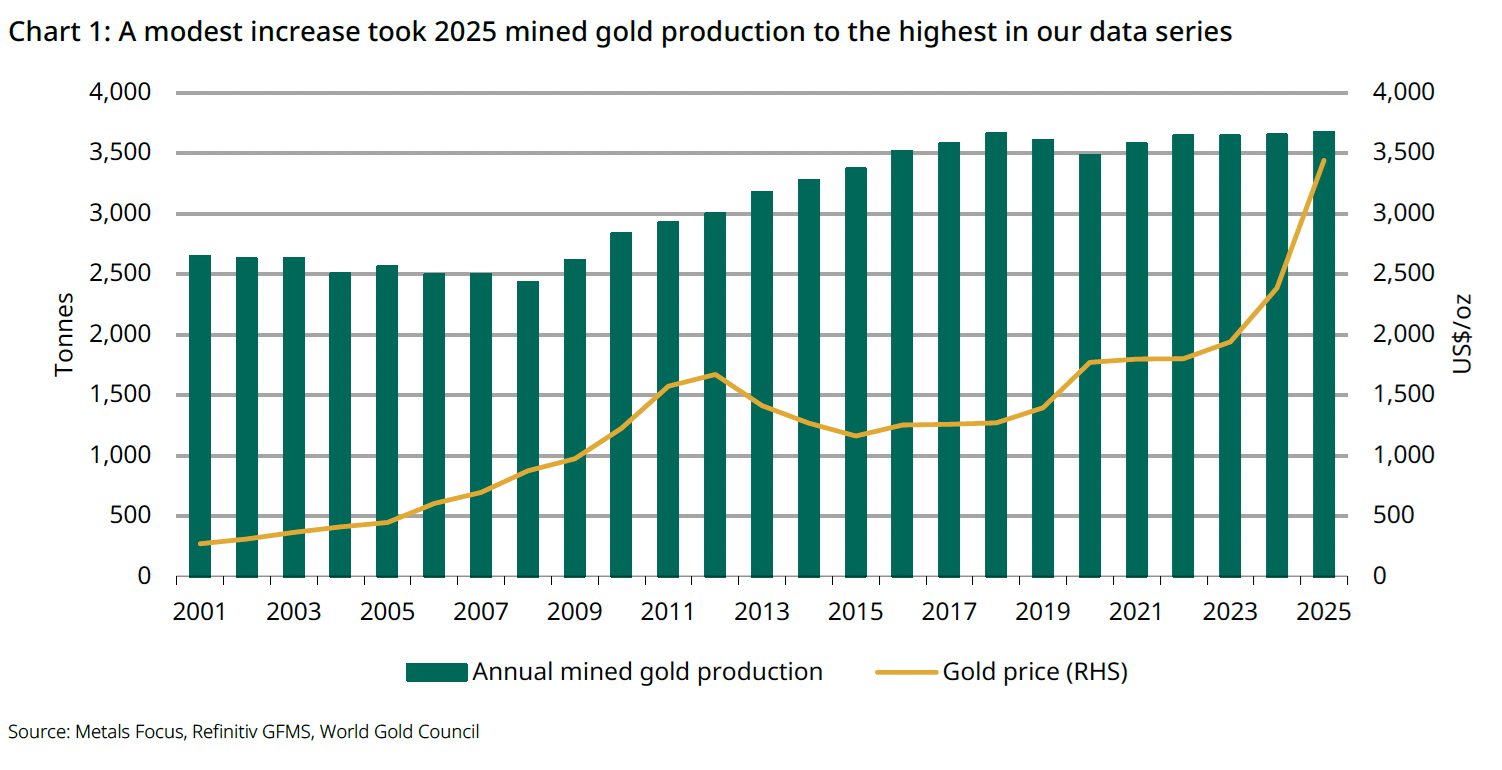 Mined gold production reached a record high in 2025, based on our 2025 Gold Demand Trends report (Chart 1). Global miners produced 3,672 tonnes of gold, a modest year-on-year increase of 1% and the highest in our data series – albeit this may be subject to revisions when more data becomes available.[1] And we expect mined gold production to further increase in 2026 – at a mild pace – as operations resume at two major mines.
