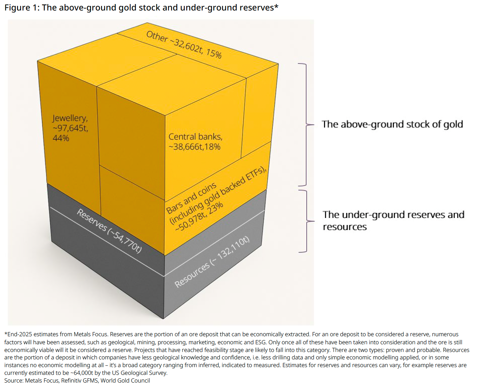 Metals Focus estimates that there were 54,770 tonnes of gold reserves by the end of 2025, i.e. the portion of an ore deposit that can be economically extracted under conditions as of 2025, whereas the US Geological Survey (USGS) data estimates gold reserves to be around 64,000 tonnes.