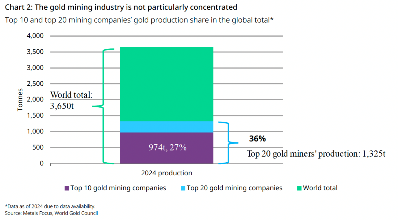 Second, the gold mining industry is globally diverse and its concentration ratio is low. The top ten gold producers accounted for 27% of total global production. It would be difficult to persuade all gold miners to act collectively, not to mention artisanal and small-scale gold mining (ASGM) supply, which accounted for around 20% of the global total in 2024, based on our estimate[6]; these ASGM sources are even less likely to be responsive to attempts to constrain production. Lastly, monopolistic actions, such as coordinating production cuts across the gold industry, are illegal in many jurisdictions.[7]
