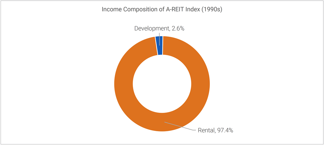 In the 1990s, there were well over 20 listed REITs, with all but one earning passive rental income. The one exception was Stockland Trust Group where residential land subdivision accounted for ~20% of net income. Stockland was widely considered to be the ‘risky one’2.