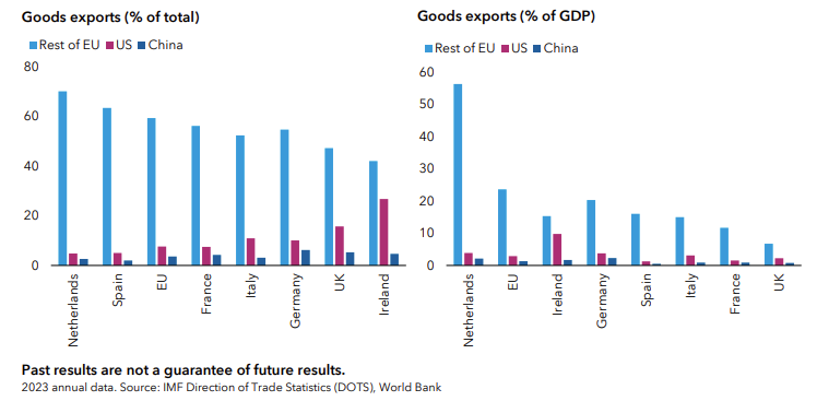 When total trade flows are considered, the US accounts for less than 10% of goods exports and less than 3% of GDP on average across EU countries.