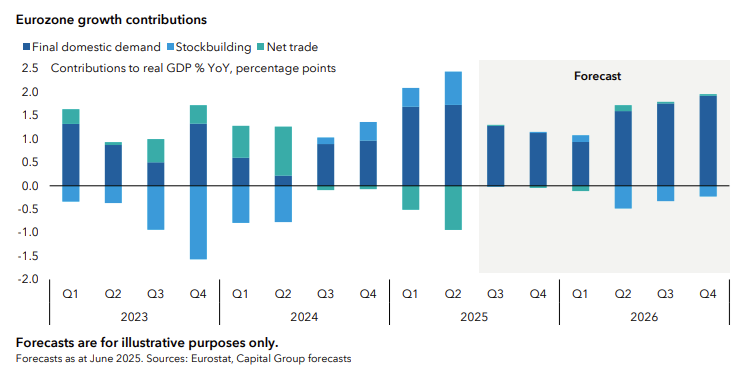 Despite higher US tariffs and uncertainty, recent data releases have surprised to the upside. The eurozone grew by 0.2% (quarter-on-quarter) in Q3 2025, with France expanding by 0.5% (quarter-on-quarter) amid stronger business investment. Unemployment in the eurozone remained near its record low in September 2025 and interest rate cuts the European Central Bank (ECB) has made since June 2024 are increasingly feeding through to strong borrowing demand. Manufacturing and sentiment surveys also indicate encouraging results for the fourth quarter of 2025.[6]