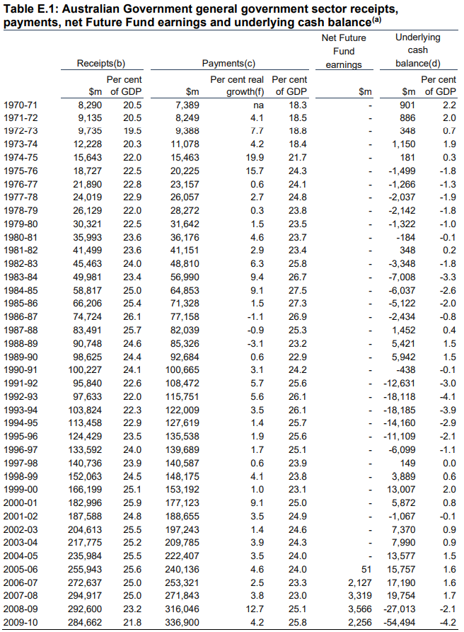 Source: budget.gov.au - Mid-Year Economic and Fiscal Outlook 2024–25, Appendix E: Historical Australian Government Data.