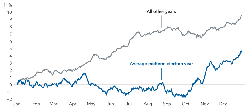 Capital Group examined more than 90 years of data and found that markets tend to behave differently during midterm election years. Our analysis of returns for the S&P 500 Index since 1930 revealed that the path of stocks during midterm election years differs noticeably compared to other years.