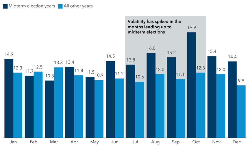 It may come as no surprise then that market volatility is higher in midterm years, especially in the weeks leading up to the election. Since 1970, midterm years have a median standard deviation of returns of nearly 16%, compared with 13% in all other years.