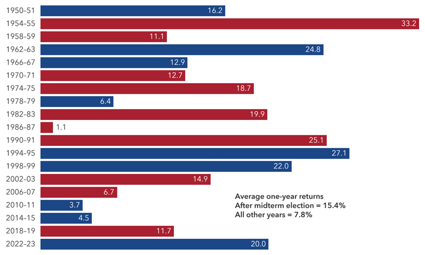 The silver lining for investors is that markets have tended to rebound strongly after Election Day. Above-average returns have been typical for the full year following an election cycle. Since 1950, the average one-year return following a midterm election was 15.4%. That is nearly twice the return of all other years during a similar period.