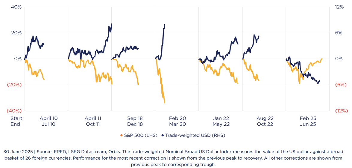 Figure 1: Trade-weighted US dollar performance during each S&P 500 correction of at least 15%, April 2010 to June 2025.