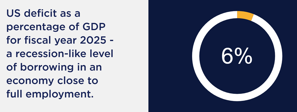 The first concern is fiscal policy. The US continues to spend far more than it raises in tax revenue, running a deficit of roughly 6% of GDP – a recession-like level of borrowing in an economy close to full employment. Even Elon Musk's DOGE (Department of Government Efficiency) initiative failed to make a dent. Each year of overspending adds to an already enormous debt pile. Were the US to experience a downturn, this leaves the government with fewer levers to pull.
