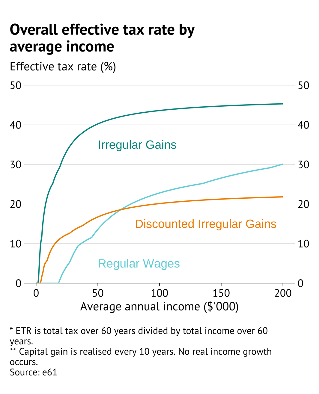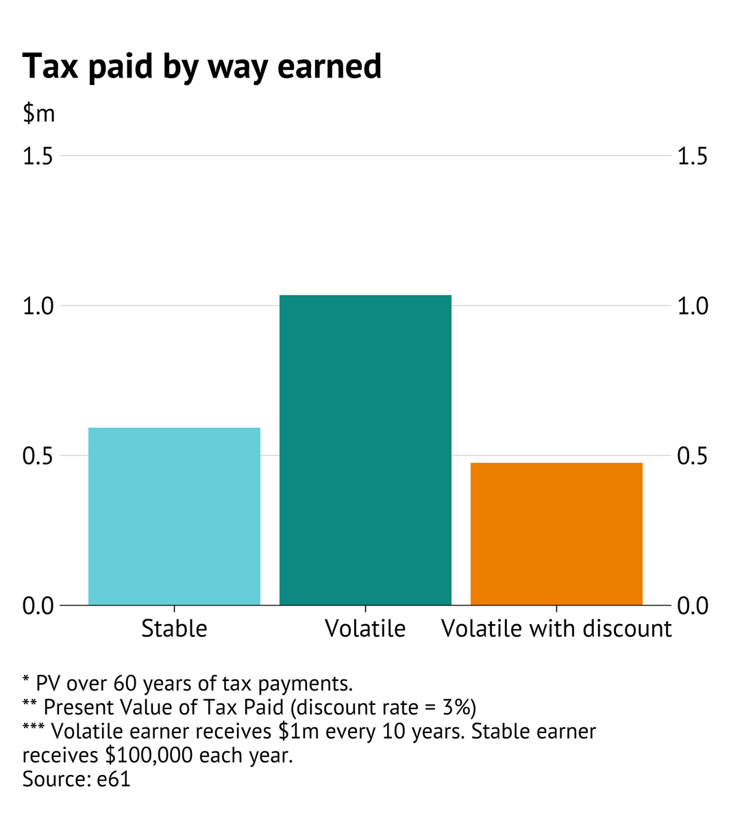 To take a stylised example, an entrepreneur with lumpy income – earning the average full-time income as a capital gain once every 10 years – would pay 75% more tax than a wage earner receiving the same total lifetime income steadily over time.