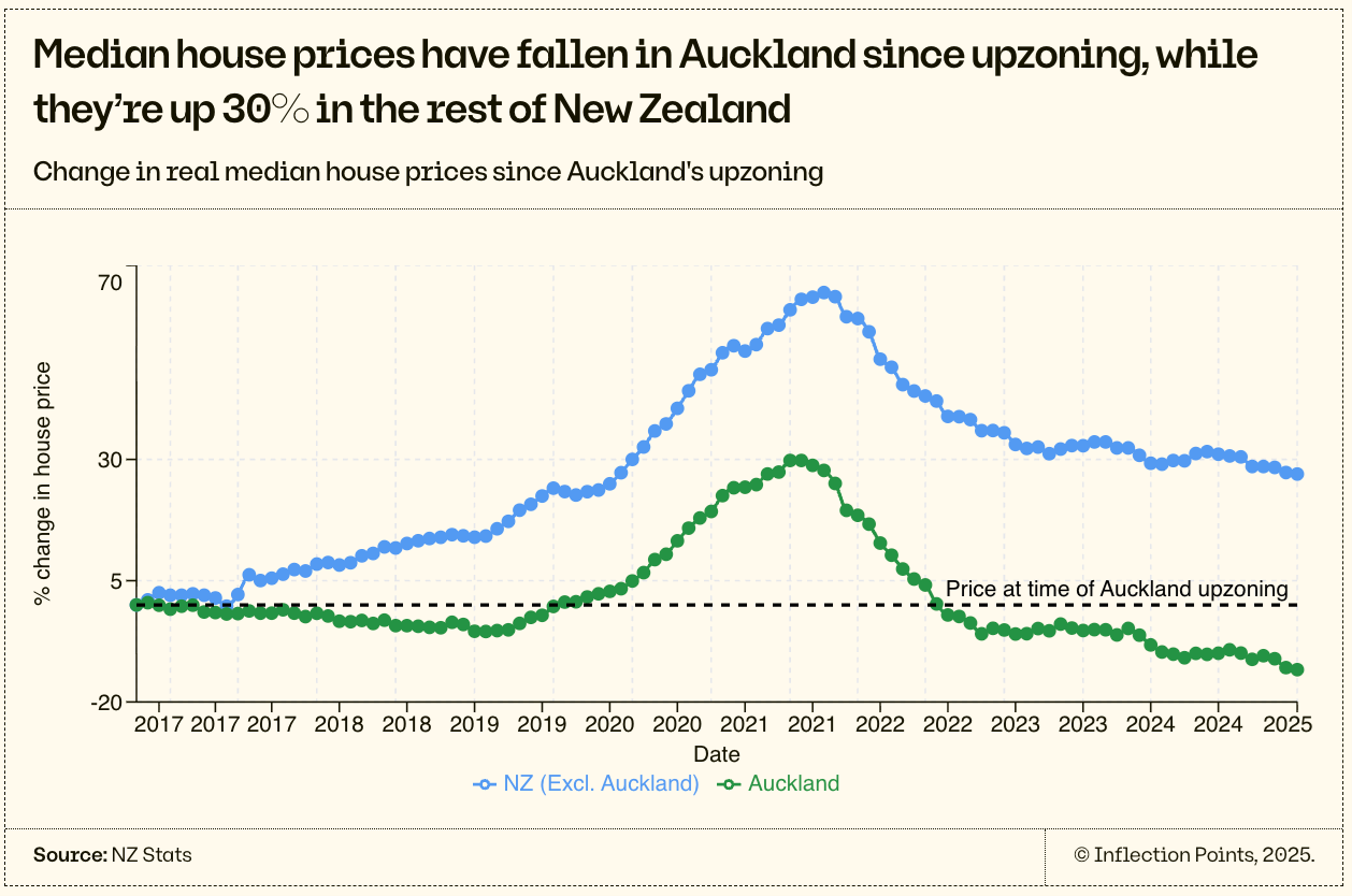 Scaled across a city, that delivers more homes, lowers prices and increases aggregate wealth. We’ve seen that very dynamic play out in Auckland, whose prices fell 13% relative to other kiwi cities as new construction boomed. Replacing just a small fraction of Australia’s detached houses with apartments could unlock billions in housing wealth.