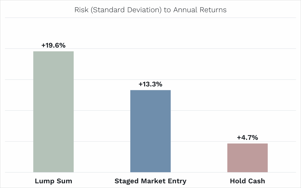 If we look at the ‘risk’ to those average annual returns we saw above – or the spread of outcomes around those averages – we see that lump sum investing was the riskiest.