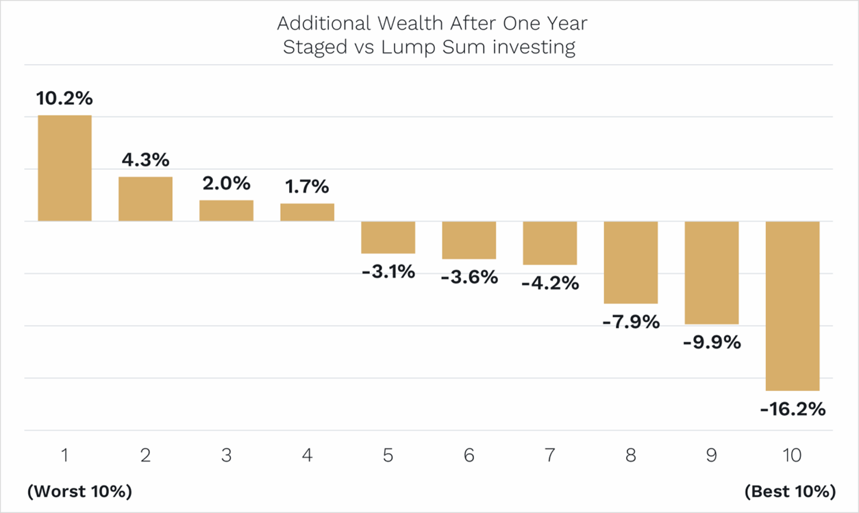 This makes sense because share markets tend to rise over a year. Delaying your investment through staged entry is, therefore, on average, going to hurt you.