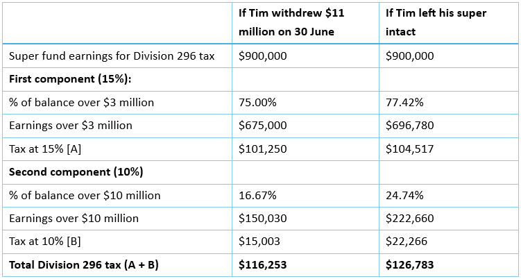 For example, what if Tim had withdrawn $11 million of his super right at the end of the year (bringing his balance down to $2,287,500)? Under the original proposal, this would have been enough to avoid Division 296 tax altogether. His super ‘earnings’ might still be very high but the percentage subject to the tax would have been 0%.
