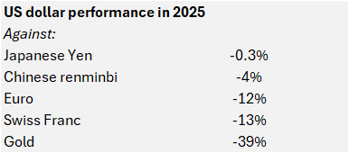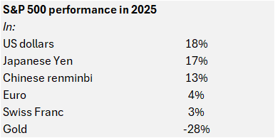Due to the fall in the value of money, the best major investment of 2025 was gold, returning 65% in US dollar terms, and outperforming the S&P 500 index by 47% (the index returned 18%).