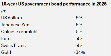 The picture for US bonds wasn’t much better. That’s because “when the value of money goes down, their real worth is lowered even as their nominal prices rise.” In 2025, 10-year US Treasury bonds returned 9% (roughly half from yield and half from price) in dollar terms, 9% in yen terms, 5% In renminbi terms, -4% in euro terms, -4% in Swiss franc terms, and -34% in gold terms. Cash in US dollars did even worse.