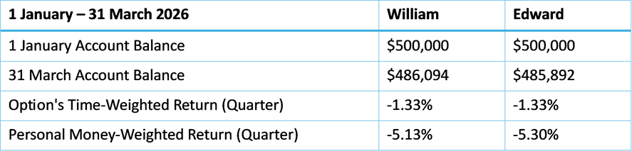 Two differences stand out. First, despite identical starting balances and identical monthly withdrawals, Edward ends the quarter with a slightly lower balance than William purely due to the sequencing risk effect of lower unit prices on his pension payment days. Second, the fund's reported time-weighted return of -1.33% differs markedly from each retiree's personal money-weighted return, a gap of around 4 percentage points.