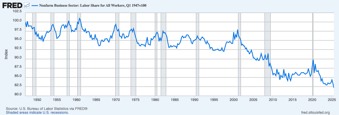 For example, the labor share of the non-farm business sector in the U.S. has declined about 15% since the turn of the century. As you can see in the chart below, labor’s share (of the non-farm business sector) was basically flat from 1947 to 2001. But it’s been on a gradual decline ever since:
