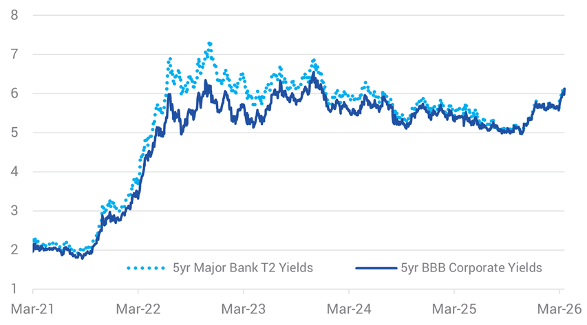 This higher rebasing of interest rates has a commensurate impact on corporate bond yields, with 5-year major bank T2 and triple B corporate yields now both back above 6% for the first time since late 2023 (refer Chart 2).