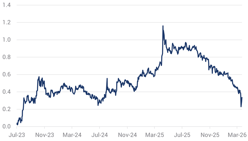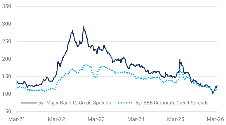 In addition to higher bond yields, the rebuilding of more rate hikes in market pricing has significantly flattened the yield curve. The difference between the 3 and 10-year bonds is now under 30bps, down from a peak of ~120bps during the liberation day selloff in April 2025 (refer Chart 4). In this environment and if sustained, a flatter yield curve should result in a steeper credit curve with investors at the very least demanding increased term premiums in the current environment (i.e. higher credit spread compensation for longer dated securities).