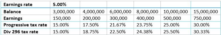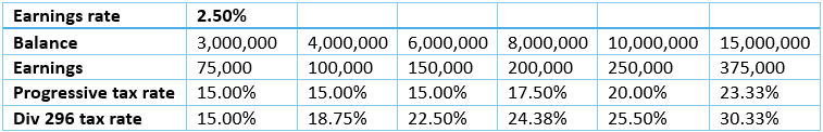 • Div 296 effective tax rate: 24.38% = 15% x (1 + (8,000,000 - 3,000,000) / 8,000,000).
