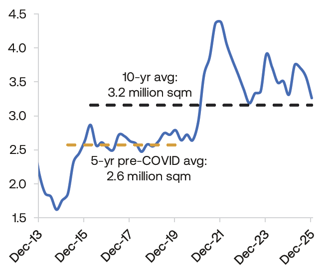 Figure 2: Industrial & Logistics - Gross leasing volumes (12-month rolling million sqm)3