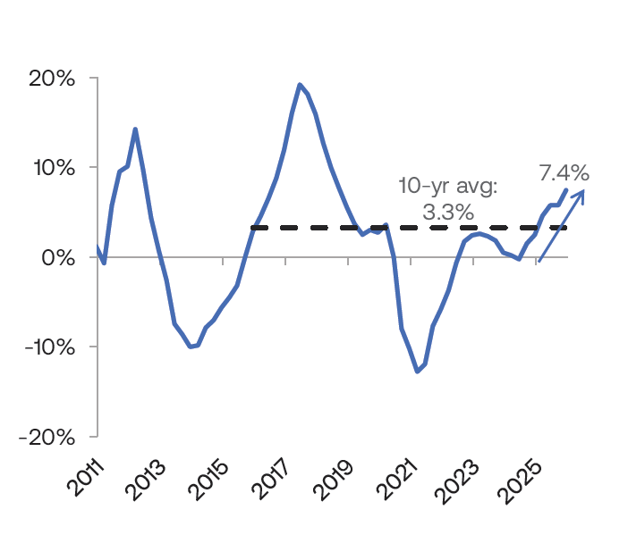 Retail specialty rents are at their highest levels since 2010, supported by limited new supply. In the I&L sector, rents have also held firm despite higher levels of new completions in recent years. Looking ahead, the combination of declining supply forecasts, structural demand drivers, and strong leasing activity should continue to support income growth across each core property sector.