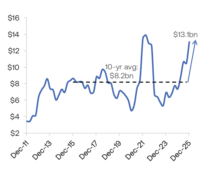 Against a backdrop of stabilising capitalisation rates and increasing market rents, indicative prime market values and returns have advanced into the next expansionary cycle. Rising transaction evidence and investor demand continue to support stabilisation, or compression, of core capitalisation rates. Quarterly investment volumes reached their highest levels since 4Q21 during 4Q25, totalling $11.7 billion across the core commercial real estate sectors. This result has been driven by investor appetite for retail property (see Figure 4) and an increase in office transactions.