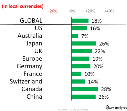 What were the key drivers in the US? Company earnings came in better than expected, rising 13% for the year. The rest of the gains came from valuation multiple expansion.