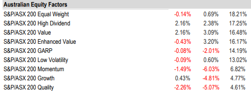 Unlike in the US, growth and momentum stocks performed poorly in Australia. Interestingly, quality stocks also trailed the pack.