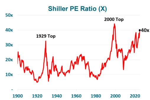 The S&P 500’s trailing price to earnings (P/E) ratio of 26x is well above the historical average of 19.8x. The current multiple was last seen in 2020-2021 before the correction of 2022, and in 1998-2001, when a bear market then followed.