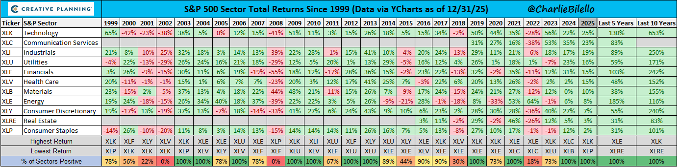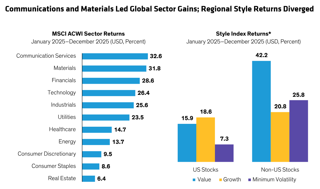 Across the board, materials were the big winner in 2025, while tech and healthcare were the big losers.
