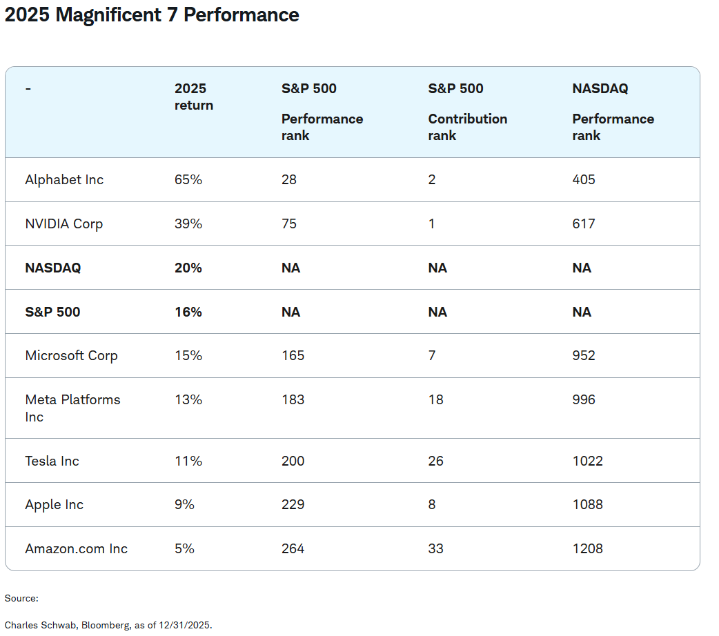 The ‘Magnificent 7’ stocks were frequently quoted in 2025, though their performance didn’t live up to the hype. It was really the Magnificent 2 as only Alphabet and Nvidia outperformed the index.