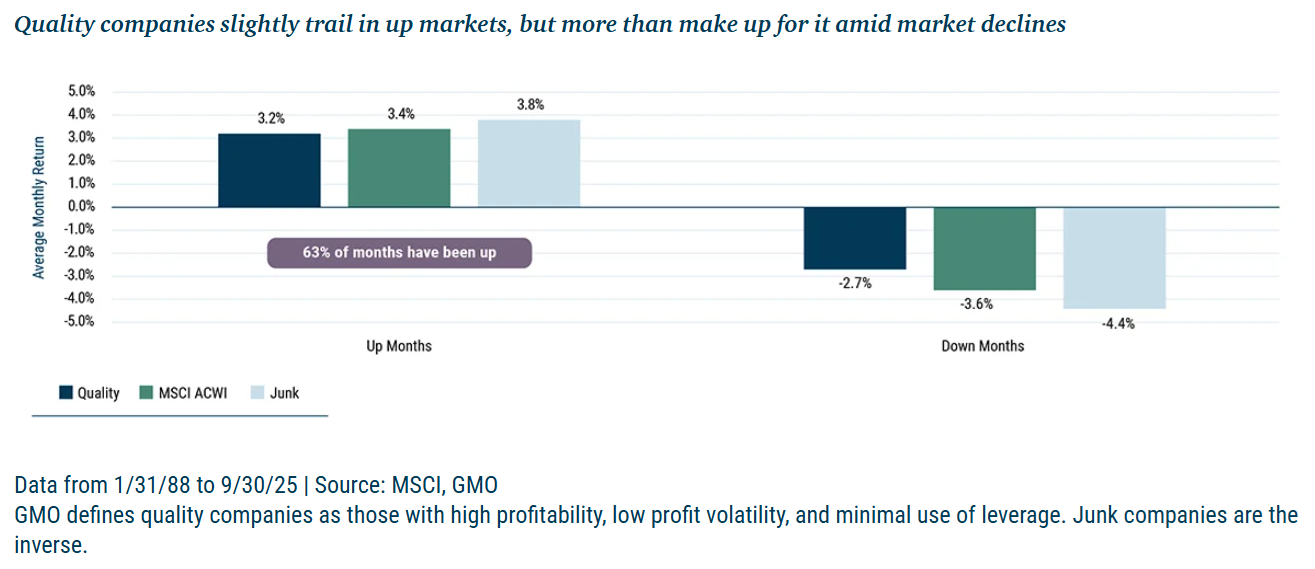 That’s less so today as quality stocks have trailed the market over the past year. In 2025, quality trailed global stocks by around 6%, and in developed markets, it was closer to 15%. These stocks were left behind as investors bid up more speculative stocks.