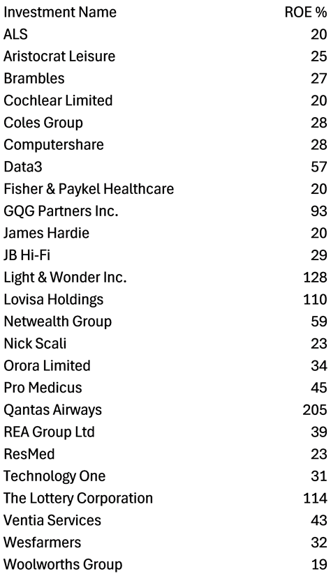 For example, if I screen for ASX 200 stocks with ROEs above 18% in 2025, it comes up with the following list, excluding mining-related companies.