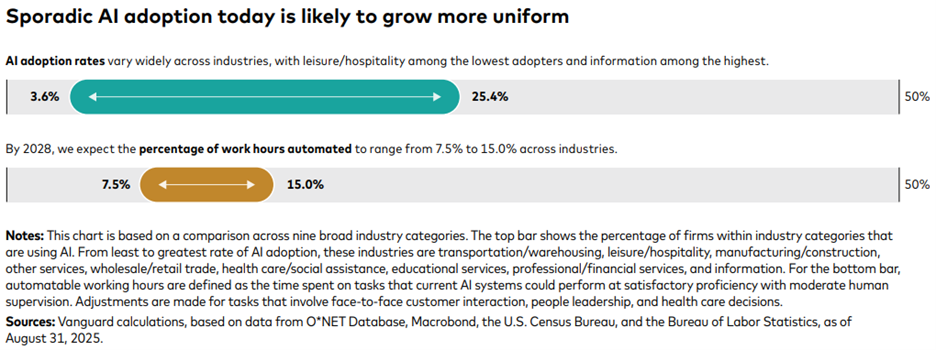 If the rate of adoption continues to expand, Vanguard believes many of the winners will be in more value-oriented sectors where efficiency gains will lead to higher earnings. These sectors include industrials, financials and select consumer segments.