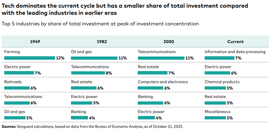 The increased adoption will be driven by continued investment. While the headline spend on the AI buildout is shocking, Vanguard provides historical context. Davis’ team compared the current share of total investment with other eras in the United States and found that there is more room to run for AI infrastructure spend.