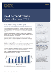 - Demand also set a Q4 record. Total quarterly demand of 1,303t was the highest ever for a fourth quarter, lifted by hefty ETF inflows (175t) and a 12-year high in bar and coin buying (420t).