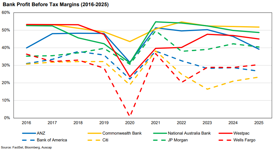 This is high by international standards. In the United States, the largest four banks, JP Morgan, Bank of America, Citibank and Wells Fargo, represent less than 40% of the total domestic assets held by financial institutions. These four institutions have averaged PBT margins of 31.2% over the same time frame. This is despite JP Morgan’s elevated margins compared to peers, a function of its asset management and investment banking activities making it less comparable to traditional banks. There are over 4,000 banks in the US compared to less than 100 in Australia. In the United Kingdom, Lloyds enjoys market leadership with 20% of the domestic market, in the same way that Commonwealth Bank of Australia enjoys its market leading position domestically. Yet again, its PBT margins have averaged 38.8% over the last 10 years. There are between 300 and 400 banks in the UK. The more competitive markets in the US and UK have witnessed lower PBT margins.