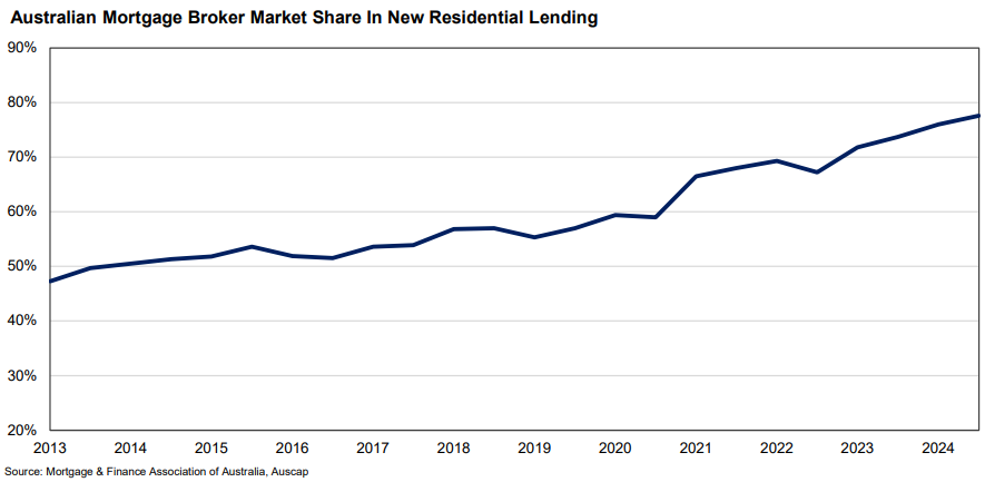 This traditional model started to change in the mid-1990s following financial deregulation. Mortgage brokers started to appear on the scene with the emergence of Aussie Home Loans and this accelerated with the emergence of other aggregators such as Wizard Home Loans in the early 2000s. Mortgage brokers rapidly became a very significant source of loan origination. By 2014, mortgage brokers were responsible for writing over 50% of residential mortgages. This percentage has since continued to climb. According to the Mortgage and Finance Association of Australia, in the September 2025 quarter, 77.3% of all new residential lending was facilitated by mortgage and finance brokers. This is 2.7% higher than a year earlier and 5.8% higher than in the September 2023 quarter.