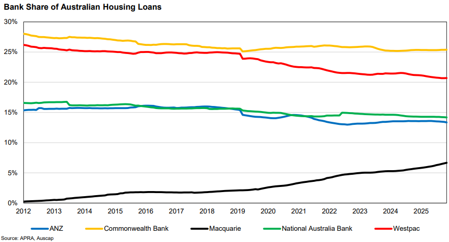 Macquarie is quickly gaining ground on ANZ and National Australia Bank’s market share. Assuming the market share of new loans for the 12 months ending 30 November 2025, Macquarie’s mortgage book would go past ANZ and National Australia Bank in market share within a decade. Of course a lot can happen in that time period, but the question is how the major banks will respond. It is difficult to see them taking a meaningful hit to profitability by changing their approach to at-call deposits, yet by capturing a greater share of deposits Macquarie is facilitating its growth in housing lending. Similarly, it would appear difficult for the major banks to immediately respond to Macquarie’s focus on improving turnaround times for mortgage brokers. It most likely requires meaningful investment in systems and technology. Given the earnings leverage Macquarie is gaining from increasing the size of its mortgage book, it seems likely that it will continue to compete aggressively in this space. Banking and Financial Services made up 20.9% of Macquarie’s net profit at the most recent result, having grown 22% on the same half a year earlier. No doubt Macquarie is eyeing the circa $30 billion in net profit after tax the big four banks make per annum.