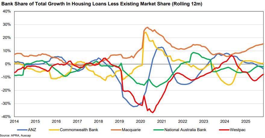 On a rolling 12 month basis, the chart above shows the difference between each bank’s share of the growth of the total Australian housing loan market and their existing market share. Macquarie has been the only bank to have consistently increased its market share since 2018, with a noticeable acceleration in the last year or so. Macquarie is benefitting from a modern technology stack that is more efficient than peers, a deliberate focus on simpler clients targeting lower loan-to-value ratio and owner-occupier lending tiers, and the absence of the costs associated with having a legacy branch network. These advantages resulted in PBT margins for Macquarie’s Banking and Financial Services division of 45.1% in the 6 months to September 2025, up from 41% on the same period the prior year and approaching the average of its much larger peers. The operating leverage from this point should continue to be substantial. In the 12 months to 30 November 2025, Macquarie was responsible for 21.6% of the growth in the Australian mortgage market, taking its share of the aggregate mortgage market from 5.7% to 6.7%.