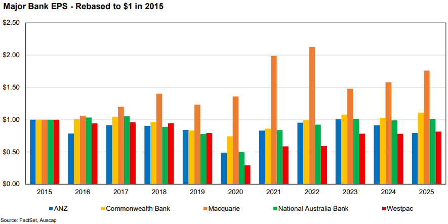 Over time Macquarie has demonstrated superior earnings growth, as the chart below highlights, and has had a higher average historic return on equity, averaging 13.8% over the last decade compared to 13.1% for Commonwealth Bank, 9.5% for ANZ, 10.7% for National Australia Bank and 9.8% for Westpac.